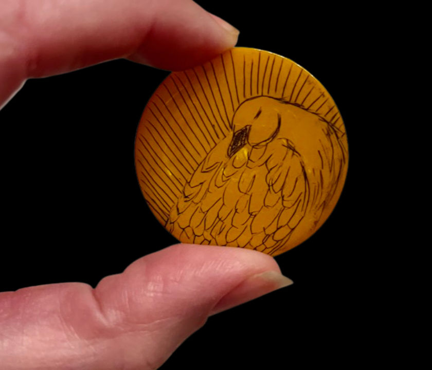 Late last year, remembering that scrimshaw prickly heart, I decided I wanted to create tokens for my partners as Chanukkah / Christmas gifts. I didn’t want to use the faux bone that was the canvas for the prickly heart, because I did not want to have to cut it into shape. I researched my options, and found some vintage game tokens made of bakelite–an early plastic made with formaldehyde that is prized for its durability, vibrant colors, and natural marbling. Two of my partners are big fans of board games, so these game pieces felt perfect. I purchased six of them.
